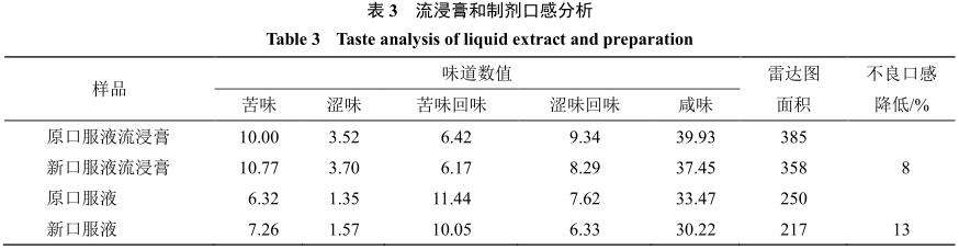 由表格3可见,新口服液流浸膏的电子舌口感雷达曲线面积由 385 减少到 358,不良口感降低 8%。在制剂阶段,新口服液的电子舌口感雷达曲线面积由 250 降低到 217,不良口感降低 13%,其中苦味回味、涩味回味和咸味均较原口服液的好。