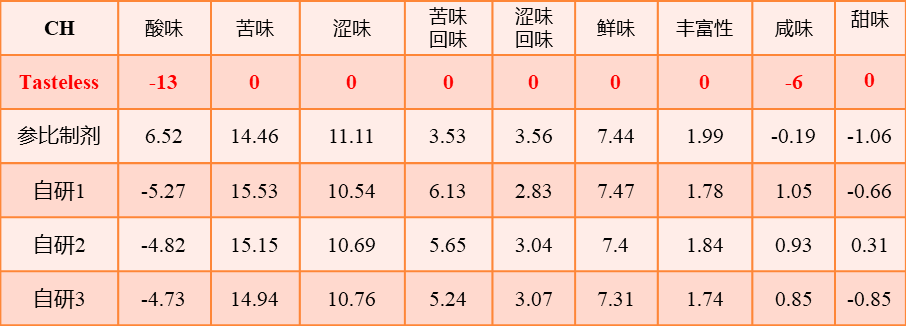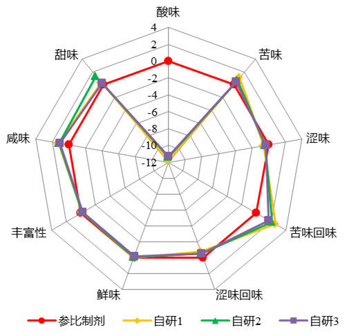 综合分析:观察味觉轮廓图的变化。理想的掩味不仅是降低苦味,还应避免引入不愉快的涩味或奇怪的鲜味,并使整体风味更协调。